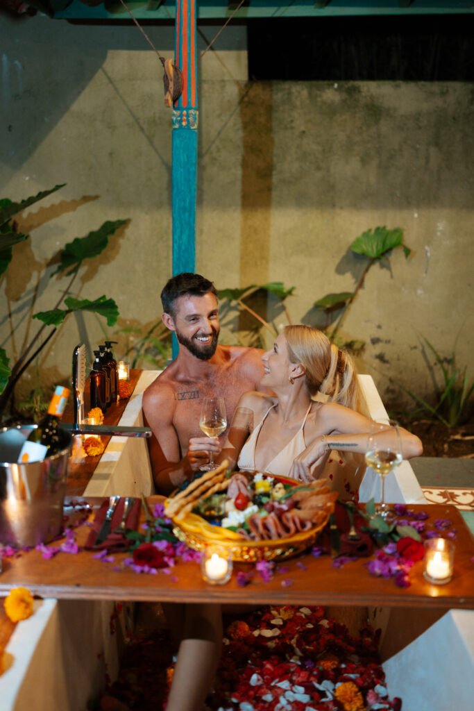 Immerse yourselves in a sensual retreat where the sweet aroma of tuberose and fresh roses mingles with the soft flicker of candlelight. Sip on fine wine, savor artisan cheese, and let love bloom in a rose-infused bath made for unforgettable moments